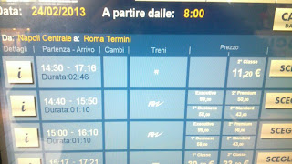 Nelle tre immagini vediamo il confronto fra macchinette automatiche (il treno c'è: 11,20€), orario in bacheca (il treno c'è, con leggerissime differenze feriali/festivi: R1898/R2398) e...sito web di Trenitalia ( http://www.trenitalia.it/trenitalia21.html ): il treno non c'è!
